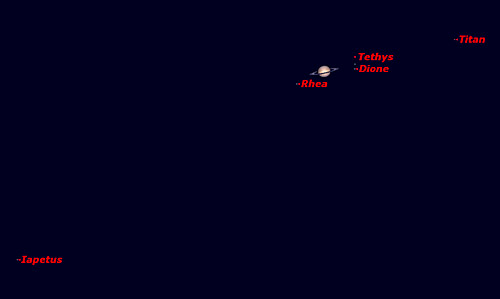 This year Astronomy Day falls on Saturday May 7, and there will be events all around the world to celebrate our favorite hobby. There's a good summary of what Astronomy Day is all about, along with listing of events all around the United States, on this web page <astroleague.org/al/astroday/astroday.html>. And here's a similar page for Canadian events <rasc.ca/astroday/resources.shtml>. If you're new to astronomy, Astronomy Day gives you a chance to experience a star party, and look through telescopes of different kinds. If you're an old timer, you're probably already participating in your club's events, but there's an opportunity here for everyone to help get newcomers involved. Contact your local school or library to see if they are interested in hosting an event. There are plenty of resources available online, including our very own Welcome Guide to Astronomy, which you can download, print out, and distribute free of charge. Probably the greatest experience you can offer to a newcomer is the chance to look through a telescope at some favorite objects in the sky. Even though we astronomy regulars may drool over faint galaxies, such tough objects are usually lost on the general public. From my experience at dozens of star parties, I can guarantee that the most popular objects for most people are the Moon and planets, especially Jupiter and Saturn. On May 7, a 5-day-old Moon will be perfectly placed for viewing with any telescope, as will the ringed planet Saturn. I like to point out Saturn's brightest moons in addition to the more obvious rings. Starry Night® will print out a view of Saturn and its moons to help you identify them. Bright Titan, easily visible in any telescope, will be at the west side of the planet, and Rhea, the second brightest Moon will be on the east side.