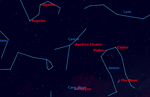 Double stars are popular targets at Astronomy Day star parties. Algieba, located directly above Regulus in Leo, is one of the finest double stars in the sky. The information in Starry Night® will give you some interesting things to tell people about this pair of stars. They are located 126 light years away from us and revolve around each other once each 620 years. A magnification of 100x should be enough to split these two stars. Open clusters are popular showpieces at low magnification. The Beehive in Cancer (Messier 44) is a fine example. Cancer is a dim constellation, located half way between Regulus in Leo and Castor and Pollux in Gemini. The Beehive actually outshines all the stars in Cancer, making for a really spectacular view in a wide-field eyepiece or even binoculars.