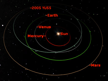 Meteor Crater. Image courtesy of the U.S. Geological Survey Due to the potentially catastrophic consequences of such collisions, NASA maintains a Near Earth Object Program which identifies and tracks comets and asteroids entering Earth's neighborhood. With their relatively low mass, these objects have their orbits slightly altered by the gravitational attraction of any nearby large planets (especially Jupiter). 2005 YU55 is such an asteroid. It is part of the Apollo group whose fairly elongated orbits cross the Earth's orbit. It is therefore possible that Earth and 2005 YU55 can have a "close encounter" twice during each orbital cycle.