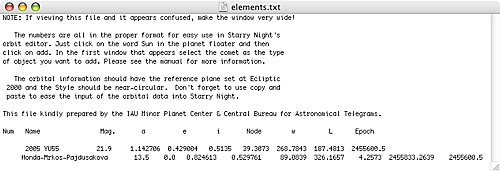 Newly updated lists of asteroids, comets, and satellites are released every morning. They include a few hundred of the brightest and most interesting objects. For most users of Starry Night this is more than adequate. Near Earth Objects Near Earth objects, primarily asteroids, are often discovered only hours before they pass near to Earth, so sometimes get missed in the daily asteroid updates. I have observed a number of near Earth asteroids, and sometimes had to add them to Starry Night manually. Orbital elements of these objects are often published after the Starry Night updates are posted each morning, and sometimes are updated several times between discovery and closest passage. This is partly because the orbits are improved as more observations are collected, and partly because the orbits themselves change significantly as the objects becomes subject to perturbations by Earth's gravity. One excellent source of up-to-date orbital elements for near-Earth asteroids and new objects is the IAU's Minor Planet Center: This is very easy to use. Enter the IDs of objects whose orbits you want in the box, one entry per line. For example, I entered two objects which will be of interest later in the year, a near-Earth asteroid and a periodic comet: