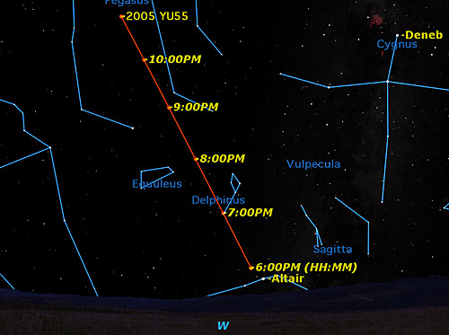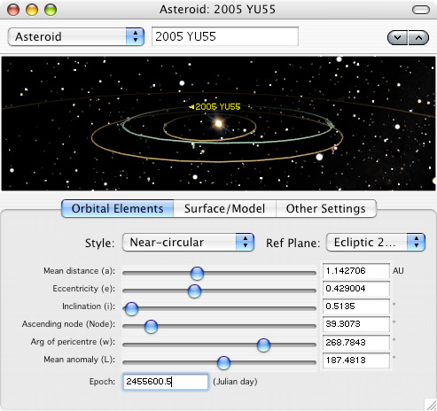 Notice how, as you enter the orbital elements, the orbit gradually forms before your eyes. Another source of orbital elements is NASA's Jet Propulsion Laboratory: Often with near Earth asteroids, these two sources will give slightly different orbital elements. In that case, I usually load both sets of elements into Starry Night and mark them “MPC” and “JPL” to distinguish between them. It's often fascinating to compare the two orbital paths in Starry Night. Once the elements are entered in Starry Night, it becomes easy to figure out that Asteroid 2005 YU55 will pass within 330,591 km. of Earth on the evening of 2011 November 8. This will put it closer to Earth than the Moon! It should be around 9th magnitude, easily visible in a small telescope or even binoculars.