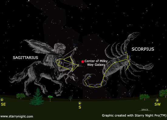The center of the Milky Way Galaxy is located just to the right of the teapots spout in the constellation Sagittarius.